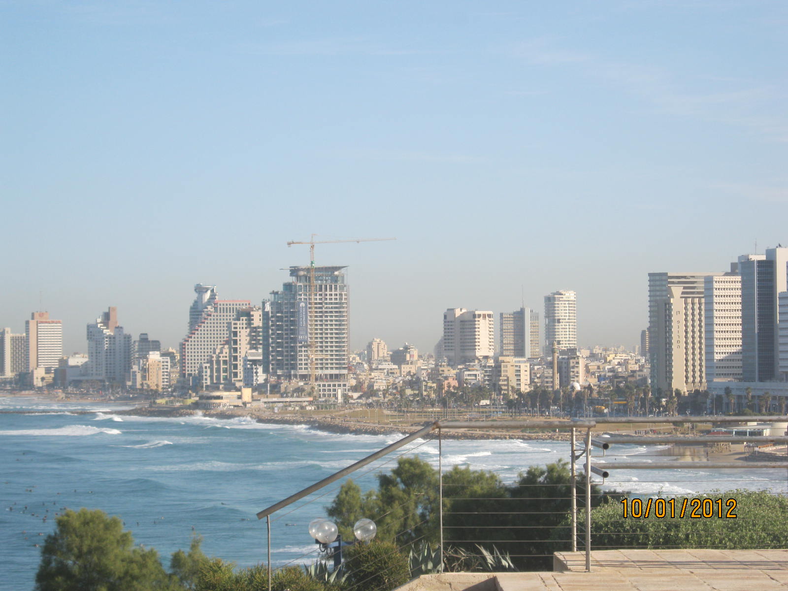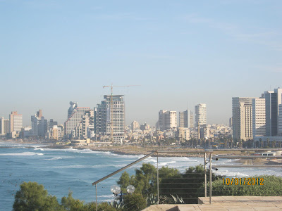 de kie oni vidas la belan pejzaĝon de la marbordo de Tel Aviv, kun la moderna